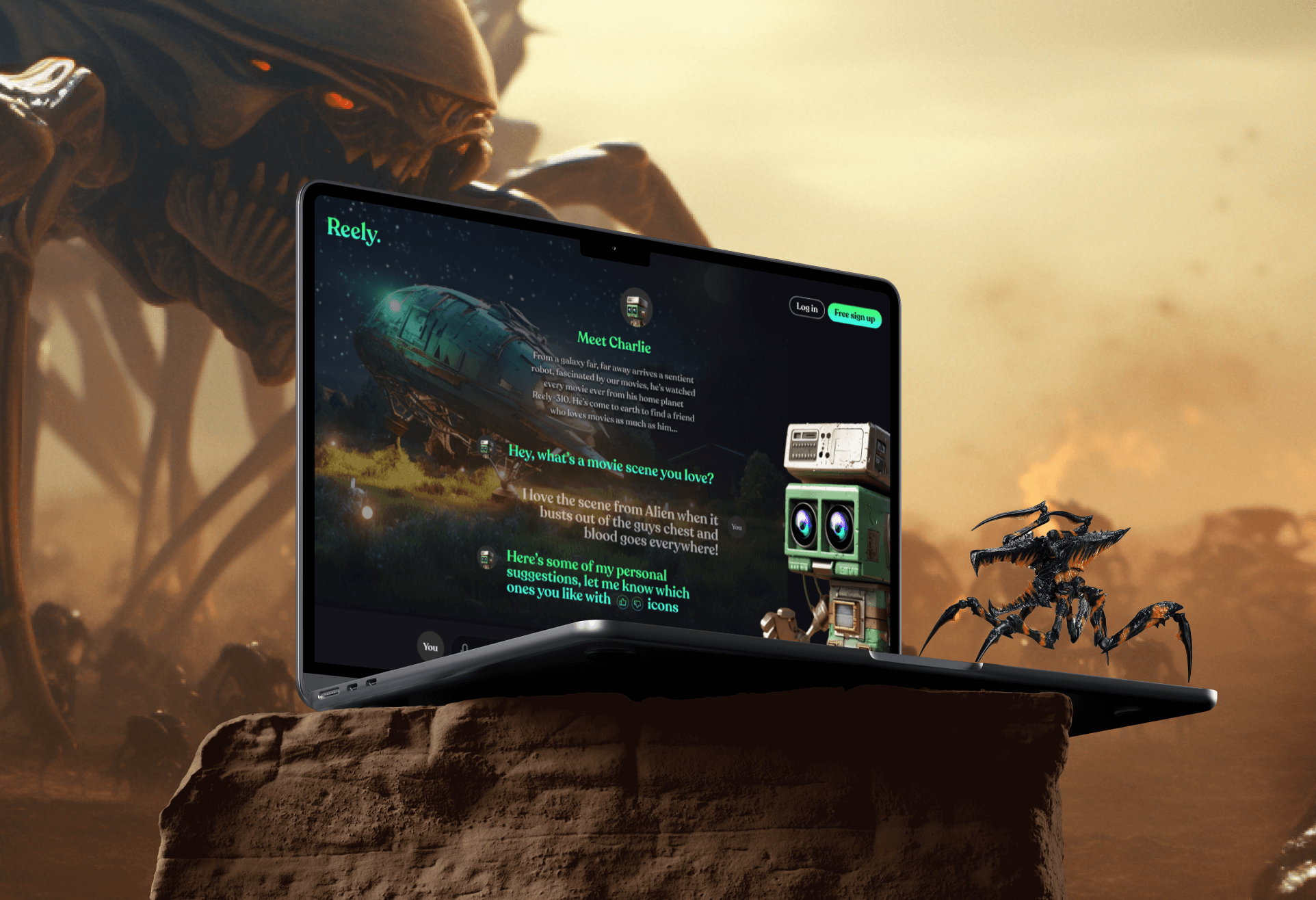 The first thing I created was Reely—our alien mascot obsessed with Earth’s films. He crash-landed here just to binge classics, and his personality helped give the brand some soul.